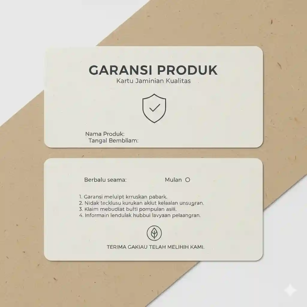 Kartu garansi adalah bagian kecil namun memiliki pengaruh besar dalam membangun kepercayaan pelanggan. Dengan memberikan kartu garansi cetak, Anda bukan hanya menawarkan jaminan kualitas, tapi juga menunjukkan komitmen terhadap kepuasan konsumen.