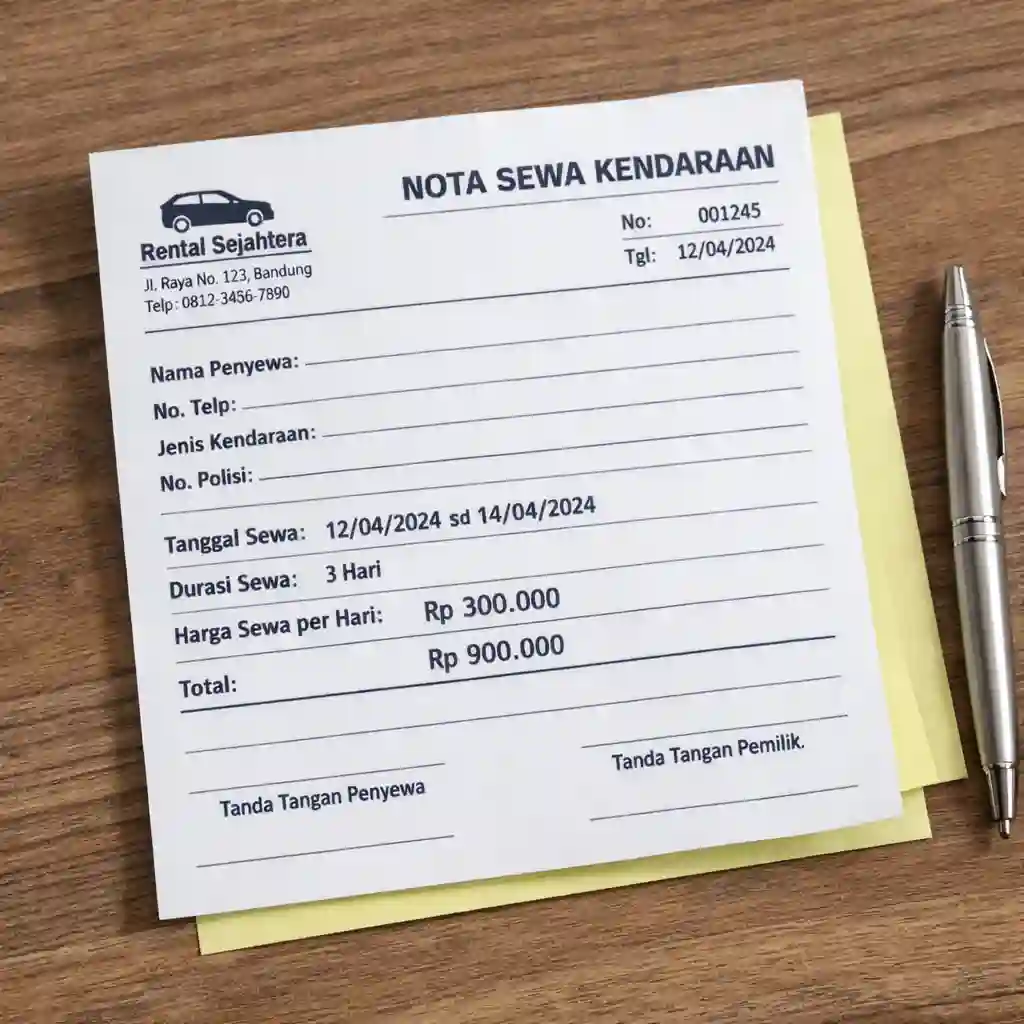 Dengan cetak nota sewa kendaraan di CetakBandung, bisnis rental Anda akan tampil lebih profesional dan terpercaya di mata pelanggan.
